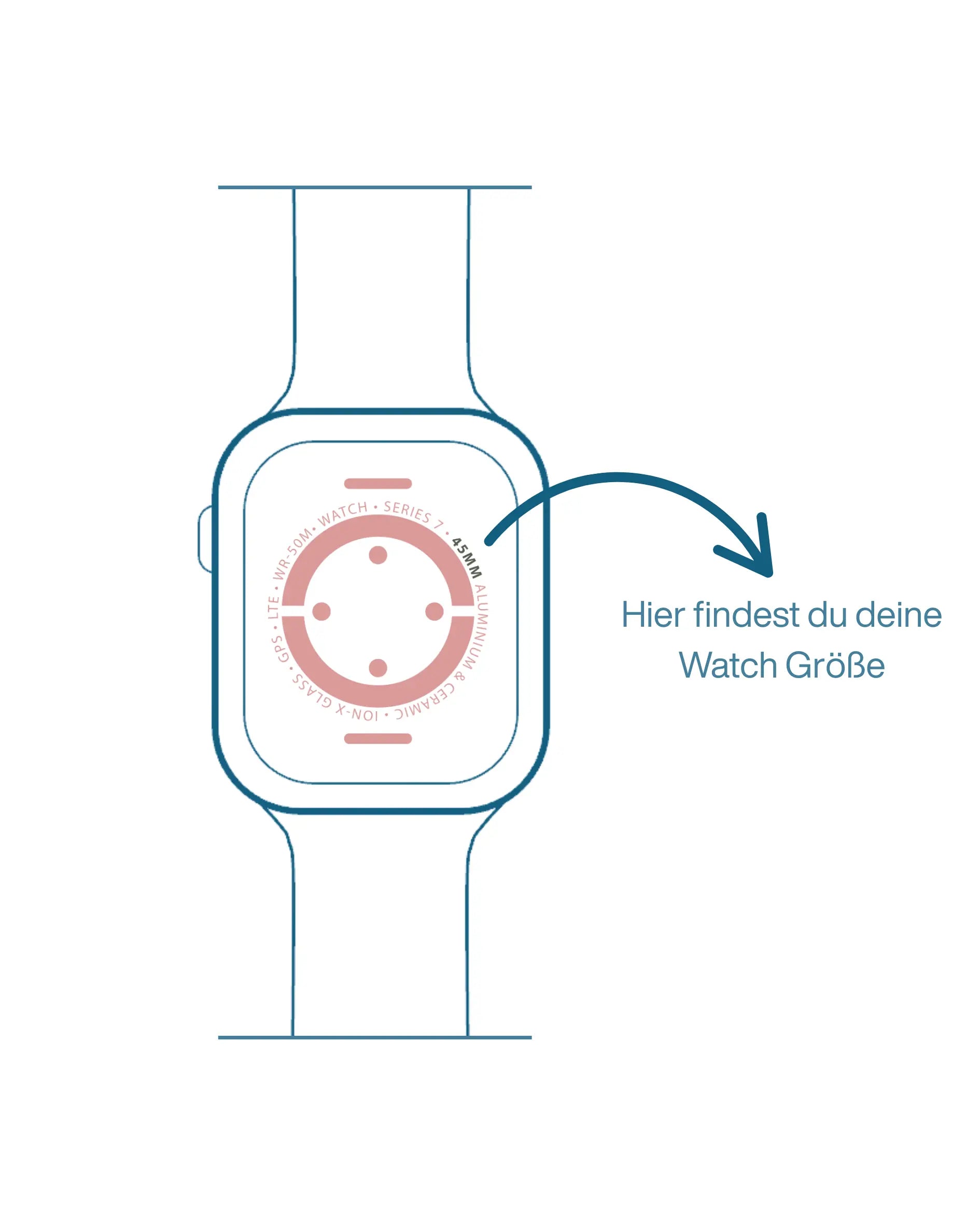 Drehe deine Apple Watch um – auf der Rückseite, rund um den Sensor, ist die Gehäusegröße eingraviert. Du findest dort z. B. “45mm” oder “41mm”, je nach Modell